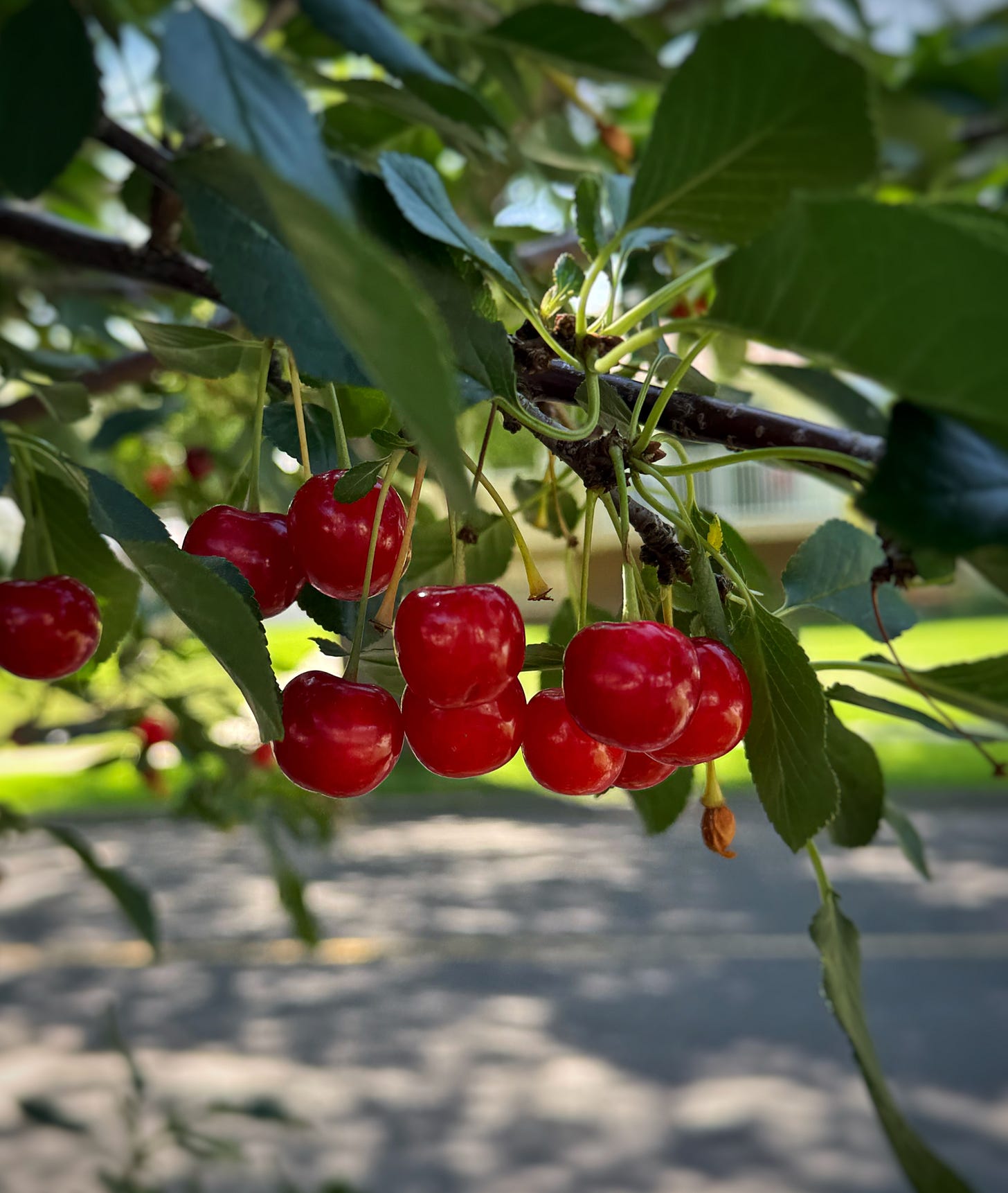 About this haiku: These cherry trees live on the boulevards on my street and I couldn’t resist taking a pic this morning. The cherries are so plump, ripe, and juicy. And soooo tart! A bit farther down the block, a mother and her two daughters were picking cherries off one of the trees and I immediately imagined sour cherry jam on a hot scone with clotted cream and a cup of tea. Perfect for the coming fall.